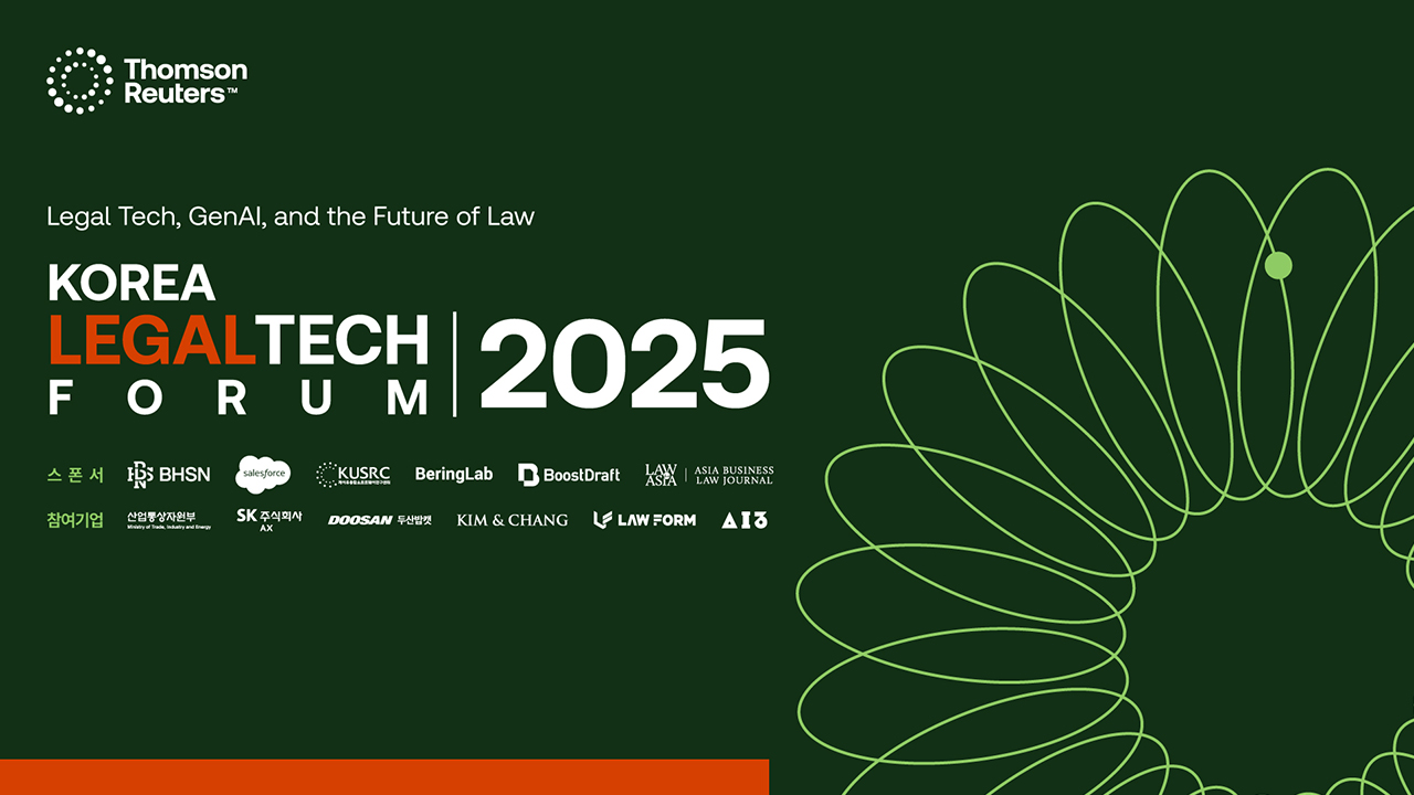 법률 산업의 신뢰성과 권위를 유지하면서, GenAI와 LegalTech의 미래를 고급스럽고 절제된 톤으로 제시하는 포럼 디자인